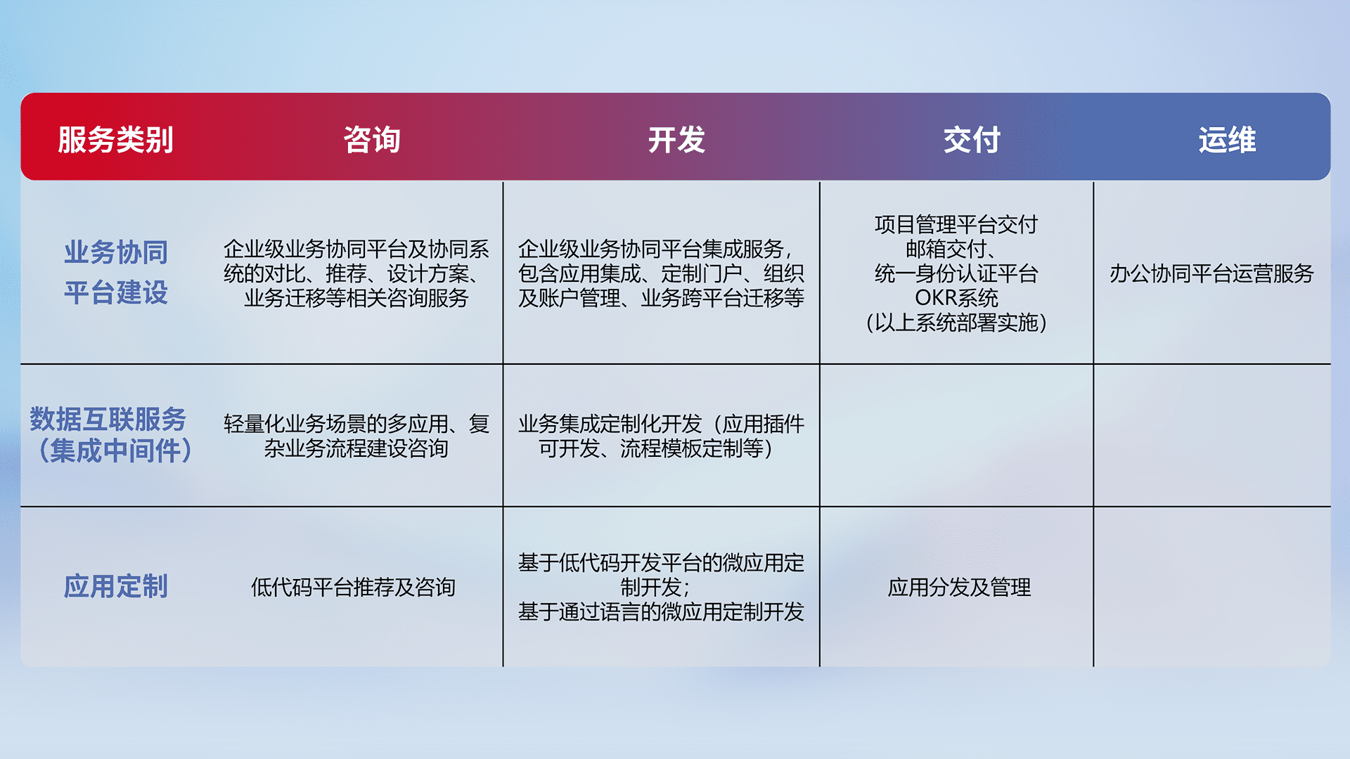 针对钉钉、、、企微、、、、IDaas等平台级产品提供产品的规划、、、方案、、、、交付、、、定制化开发等服务,,,实现如统一协同办公、、、、智能客户服务、、混合会议管理、、、、智能数据查询、、、、等业务场景,,,实现数字化转型。。。